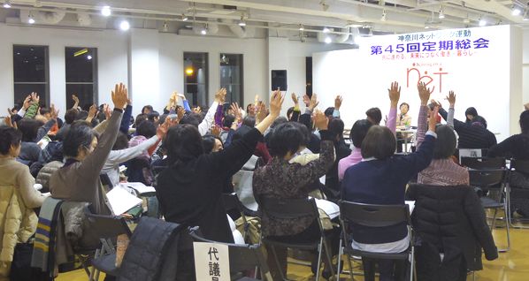 2月21日、ヨコハマ創造都市センターで第45総会を開催しました。「共に進める、未来につなぐ働き・暮らしを」をテーマに、2018年度のさまざまな政策アクションや活動を振り返り、2019年活動方針と予算を決定しました。今年は、まもなく統一地方選です。全員当選を目指し、元気に活動することを確認しました。最後に、大和の布施めぐみさんが総会アピールを読み上げ、無事終了しました。