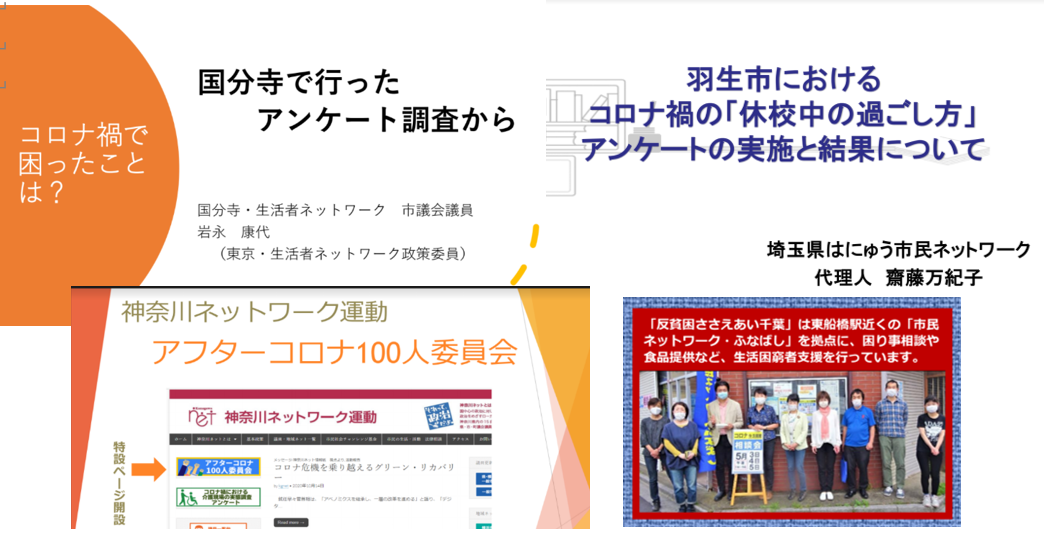 2年に1度の市民政治ネットワーク全国集会をオンラインで行いました。新型コロナウイルス感染症拡大する中、千葉ネットは相談会、東京生活者ネットでは オンラインアンケート、埼玉ネットは休校中の子どもの過ごし方アンケート、神奈川ネットからは市民と有識者からのコロナ禍後の声を集めた 100 人委員会の報告がありました。