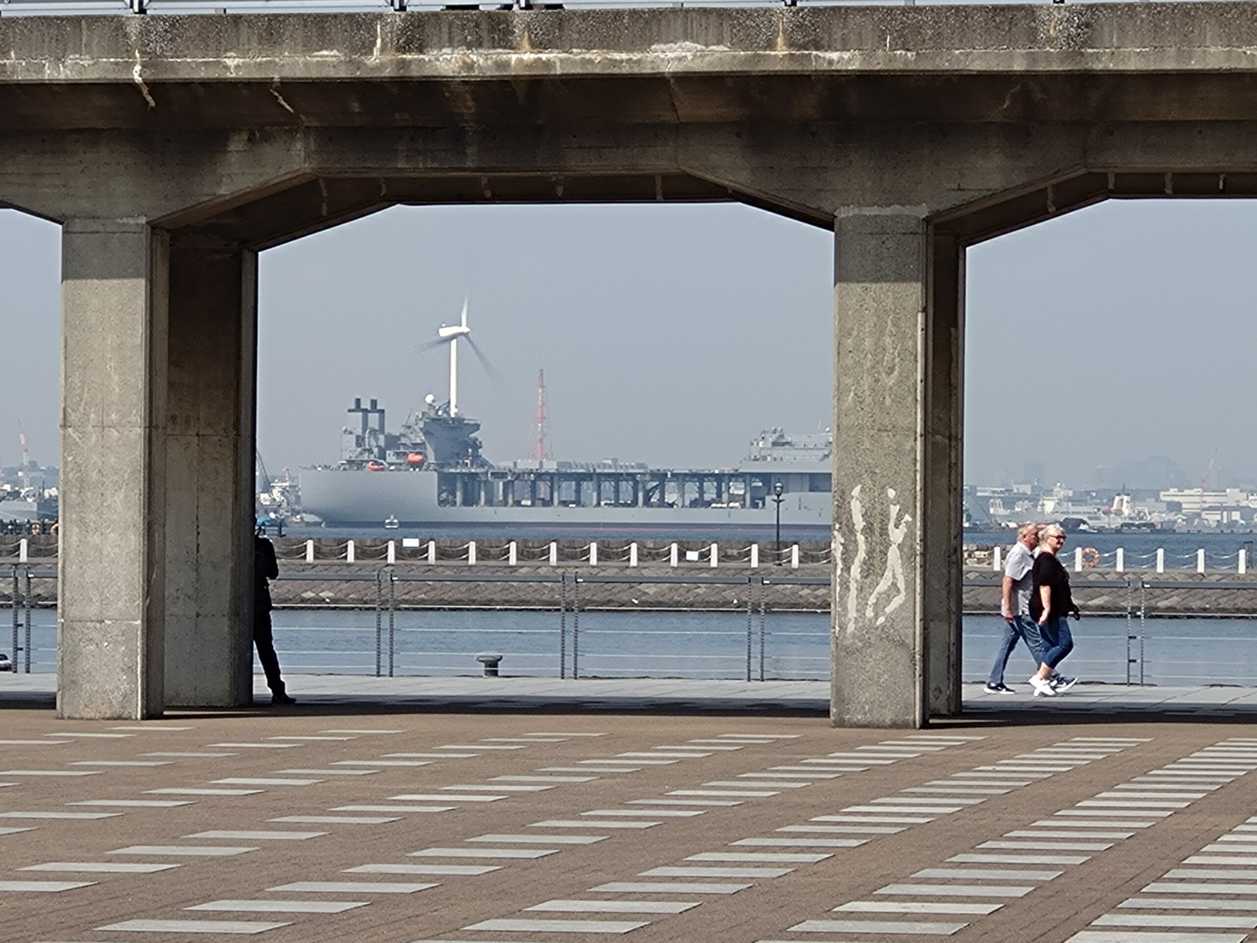 横浜港の風力発電の風車を後方に、フェリーの船着場からもはっきり確認できる見慣れない戦艦について基地を監視する市民団体に問い合わせしたところ、米軍の「遠征海上基地」(Expeditionary Mobile Base)という種類の軍艦、「ミゲル・キース」とわかりました。
