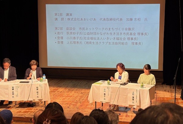 第2部の座談会では、公財かながわ生き活市民基金の理事長の荻原妙子さんの進行で、社福いきいき福祉会理事長の小川泰子さん、湘南生活クラブ理事長の上石恵さん、あおいけあの加藤さんを加えて座談会が開かれました。それぞれの活動や施設の特徴など報告があり、現状や課題などみえてきました。