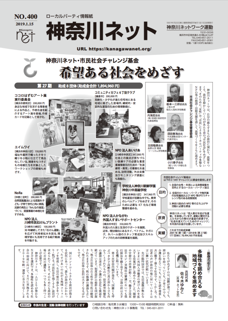 1面 ■神奈川ネット・市民社会チャレンジ基金 希望ある社会をめざす 第27期 助成団体紹介 ■新春メッセージ 多様性を認め合える地域づくりを進めます 共同代表 佐々木ゆみこ(県議/ネット宮前) ・・・・・・・・・・・・・・・・・・・・... -